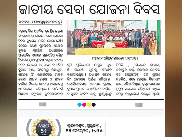 Photo/Video Gallery Photo/Video Gallery Disaster Management Training 2025 ବନ ମହୋତ୍ସବ - ୨୦୨୫ Celebrating Constitution Day 2025 ଯୁବ ରେଡକ୍ରସ ପରିଚୟାତ୍ମକ ସଭା - ୨୦୨୫ Career Counseling by United School of Business Management Bhubaneswar on 14th November 2025 Career Counseling by Pune Institute of Business Management on 3rd November 2025 Rank Ceremony with Certificate Distribution 2025 National Service Scheme 2025 National Space Day-2025 Water Testing & Awareness Program 76th Republic Day 2025 Odia Matrubhashara Asmita 2024 Swachhata Hi Seva 2024 NCC Convocation (Naval Wings) 2024 National Service Scheme 2024 Pride Moments at College Photo Gallery Video Gallery